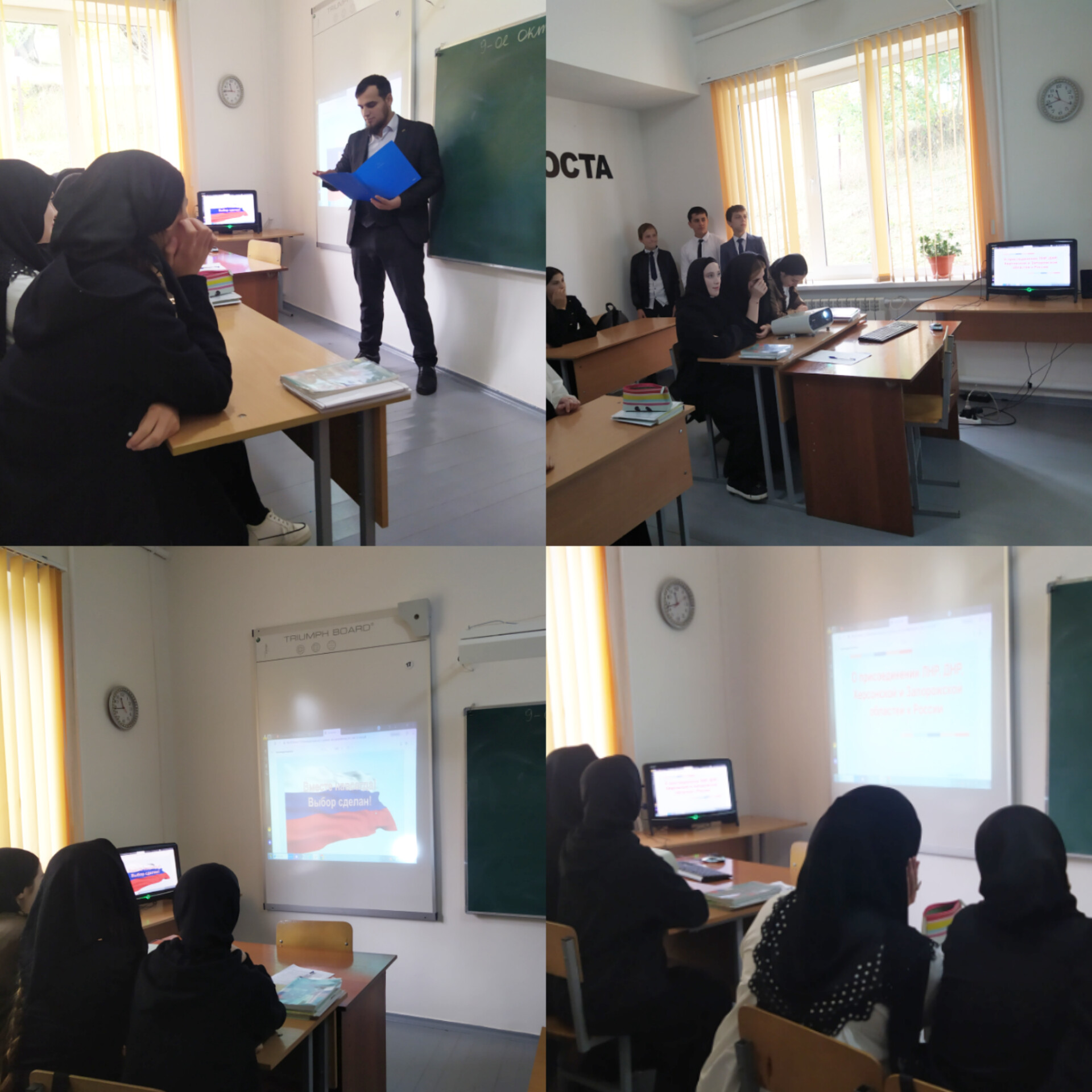 На уроке ученикам рассказали, что подписание договора о присоединении новых территорий к России стало выражением желания миллионов людей, которые хотели оставаться в составе Российской Федерации.